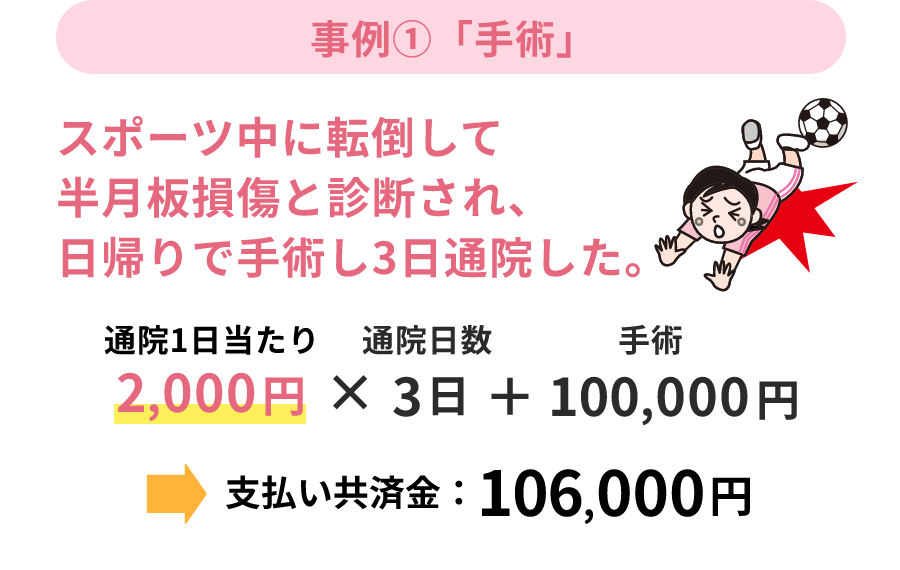 - ※上記はお支払いの一例です。同様な事例の場合でも加入コース、事故状況、治療内容等によりお支払金額が異なります。